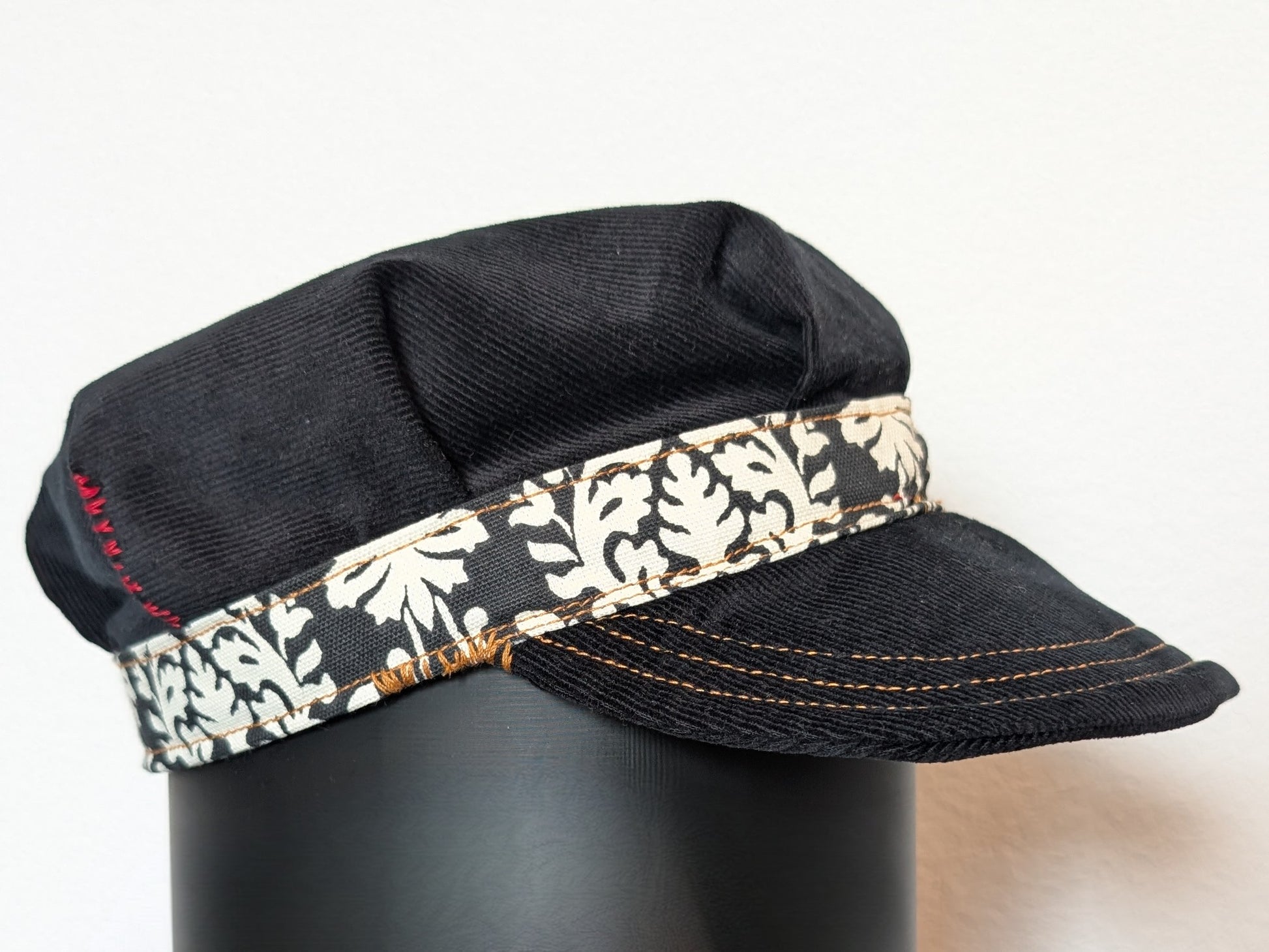 Engineer Cap made from cotton corduroy, featuring a demask patterned band. Soft, and a great weight for year-round wear!
