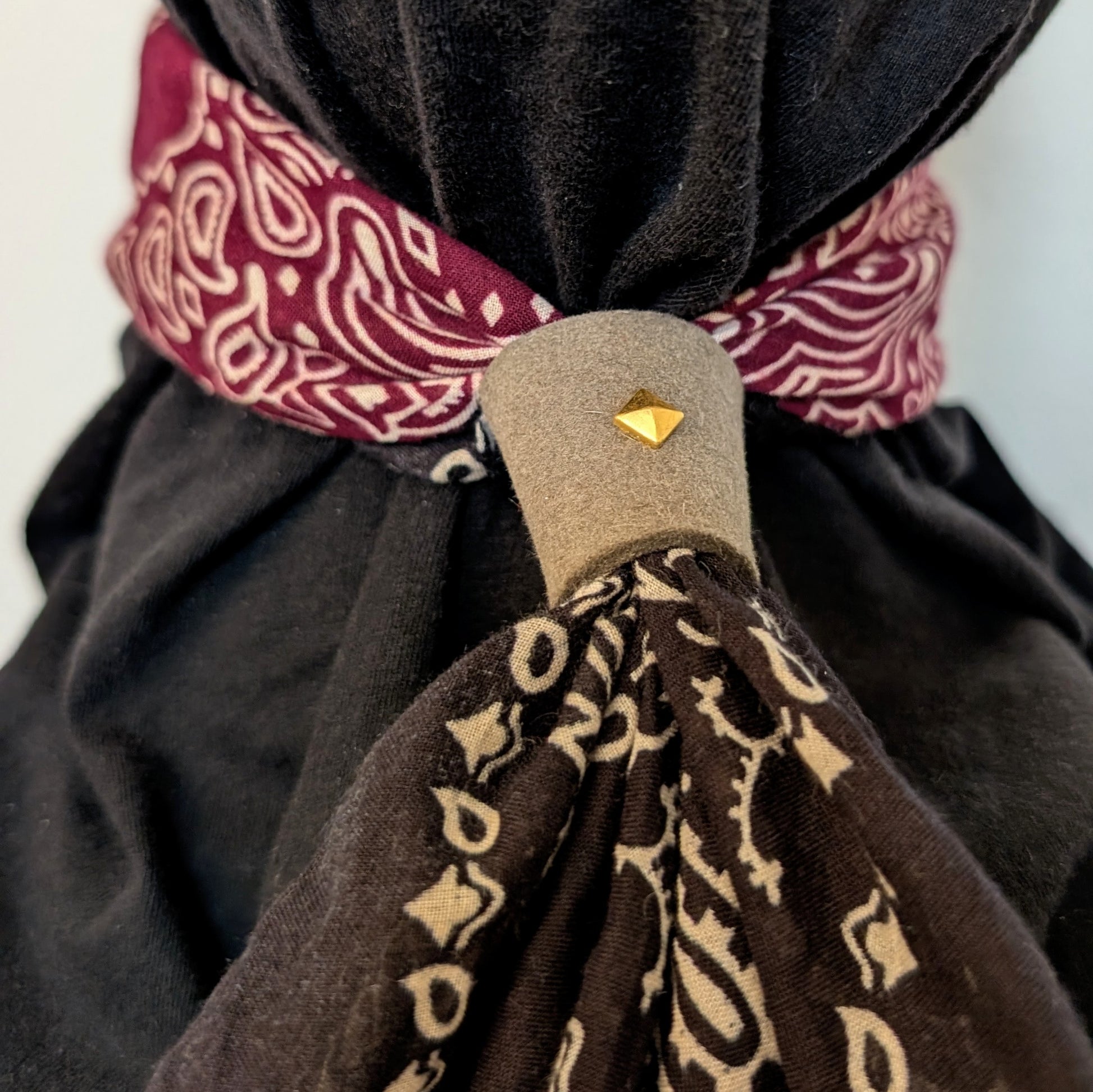 Add a little extra flair to your fit, with a Neckerchief slide! These slides are all made of remnant hat felt, that would otherwise be thrown away. (Bandana not included)