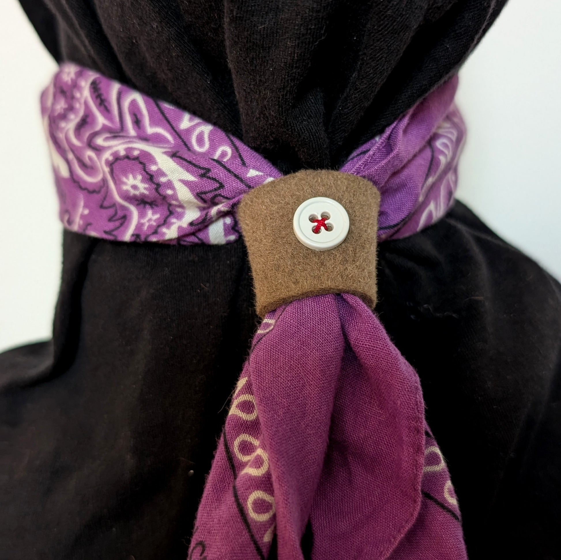 Add a little extra flair to your fit, with a Neckerchief slide! These slides are all made of remnant hat felt, that would otherwise be thrown away. (Bandana not included)