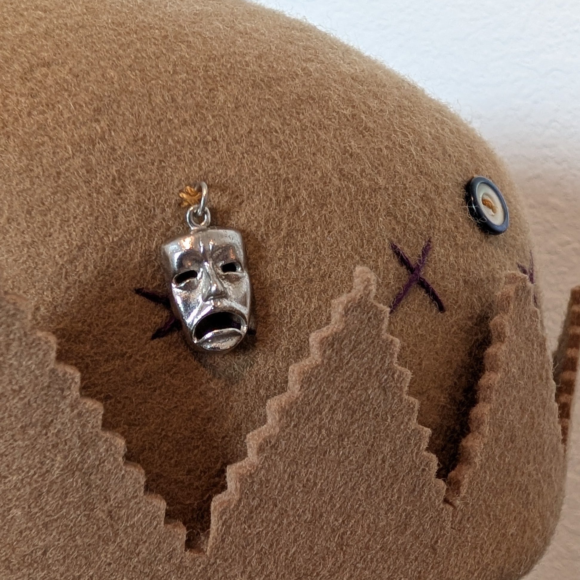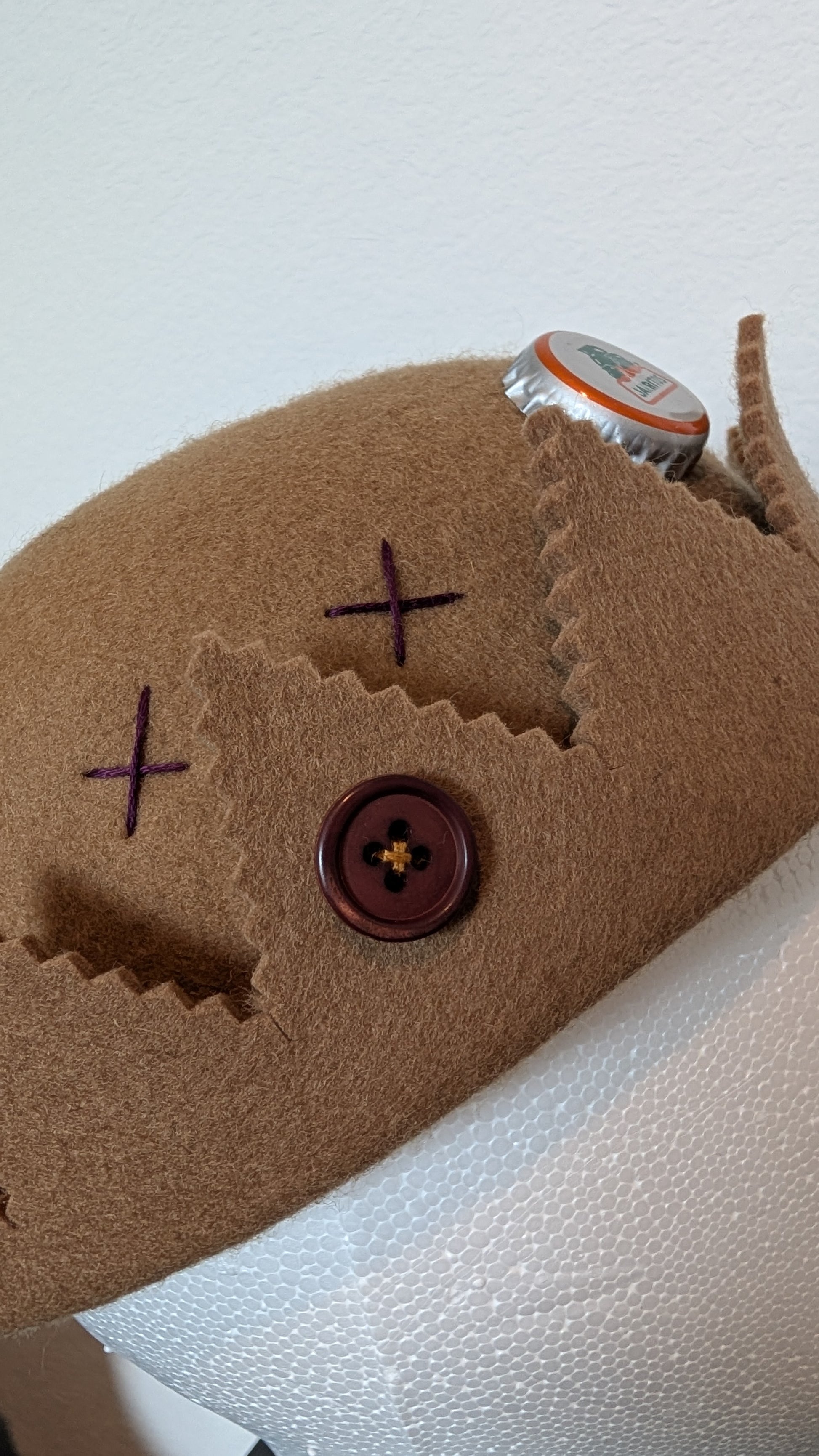Lightweight wool cap with pinked points and purple X stitching around the dome. Size Medium.