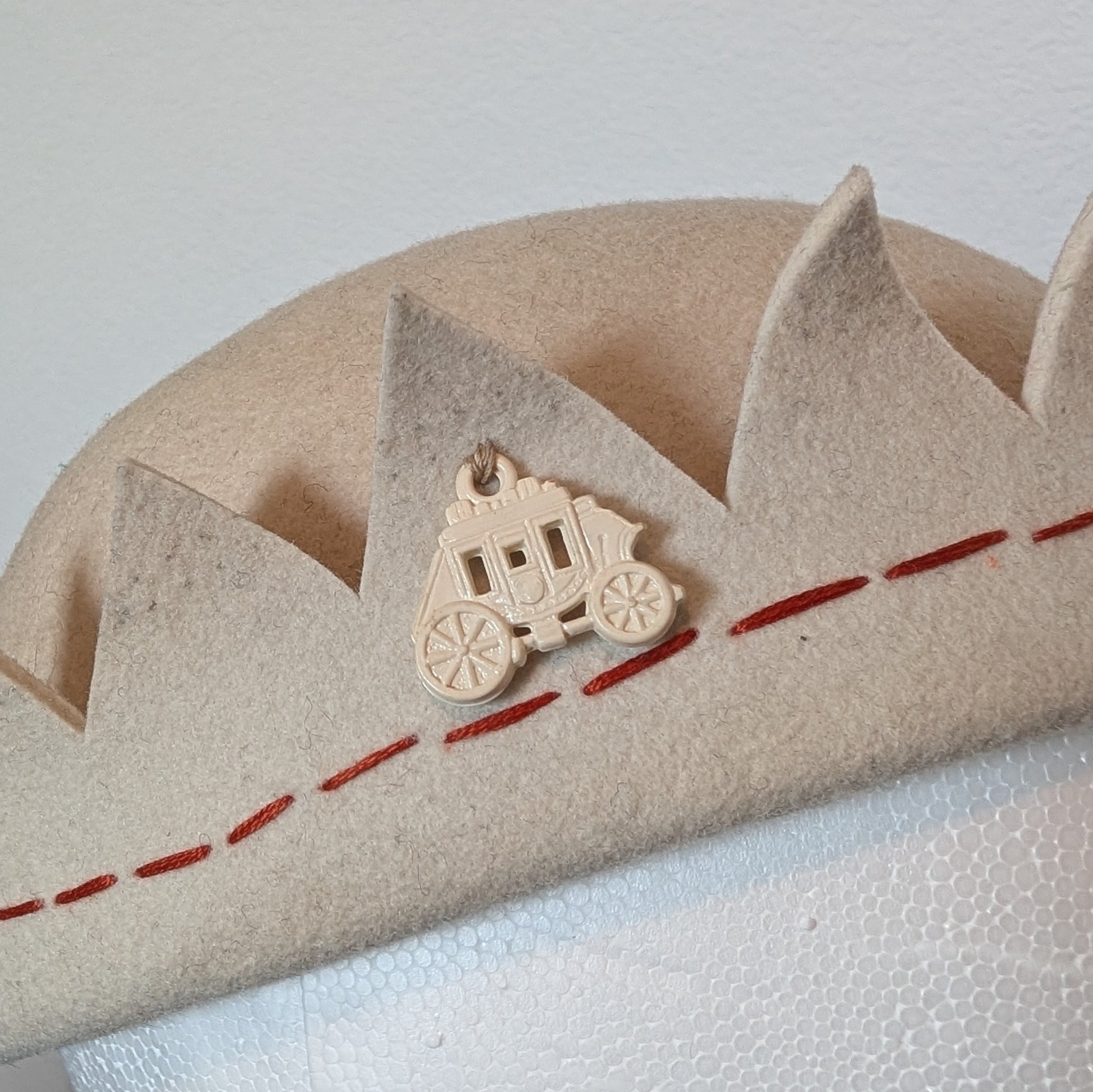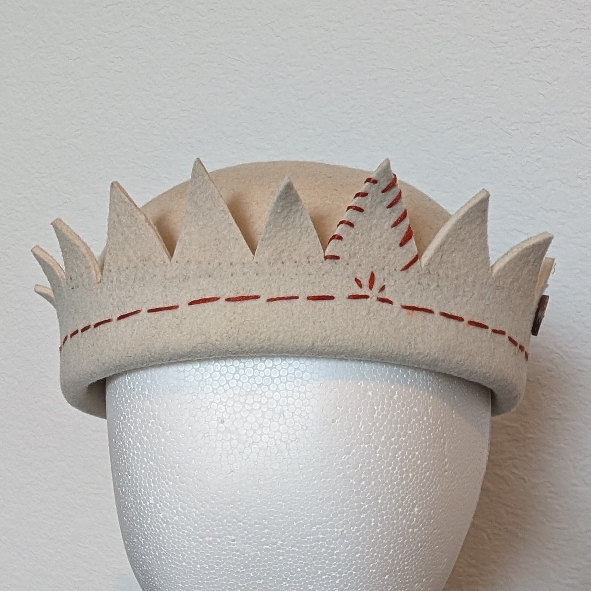 Wool cap showing a little wear. The cream color flows so well with the rust colored stitching, and the detailing on that single point is the perfect touch. Size small.