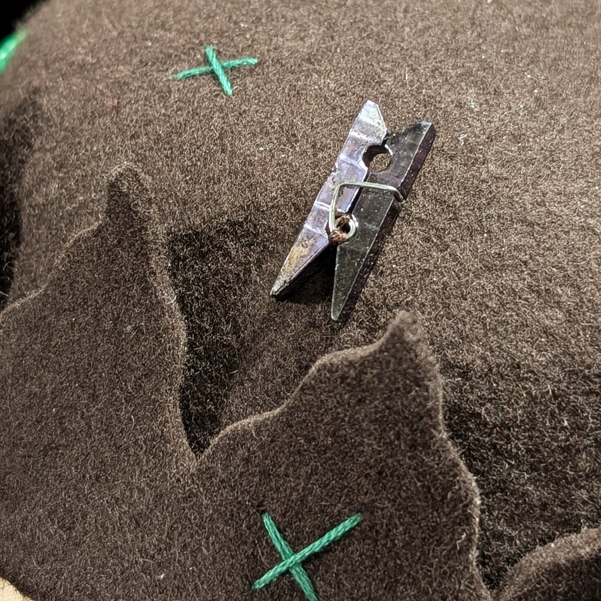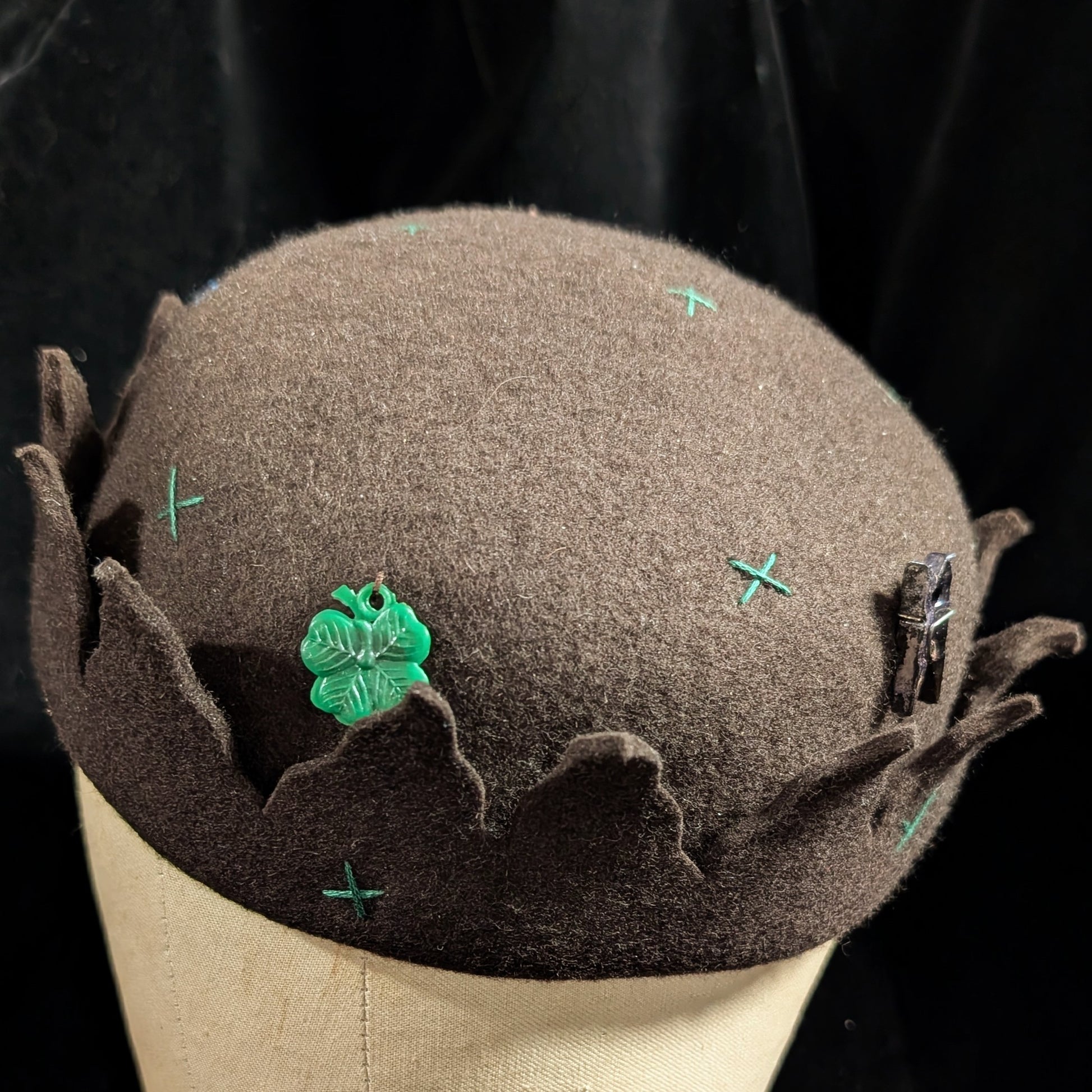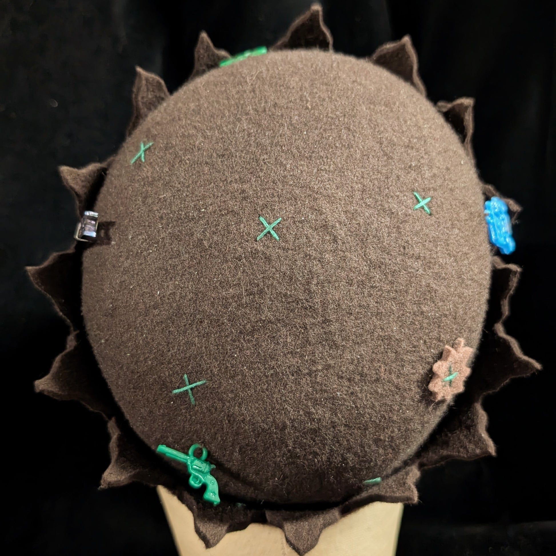 Dark brown felt with forest green X stitches all over with wavy points.