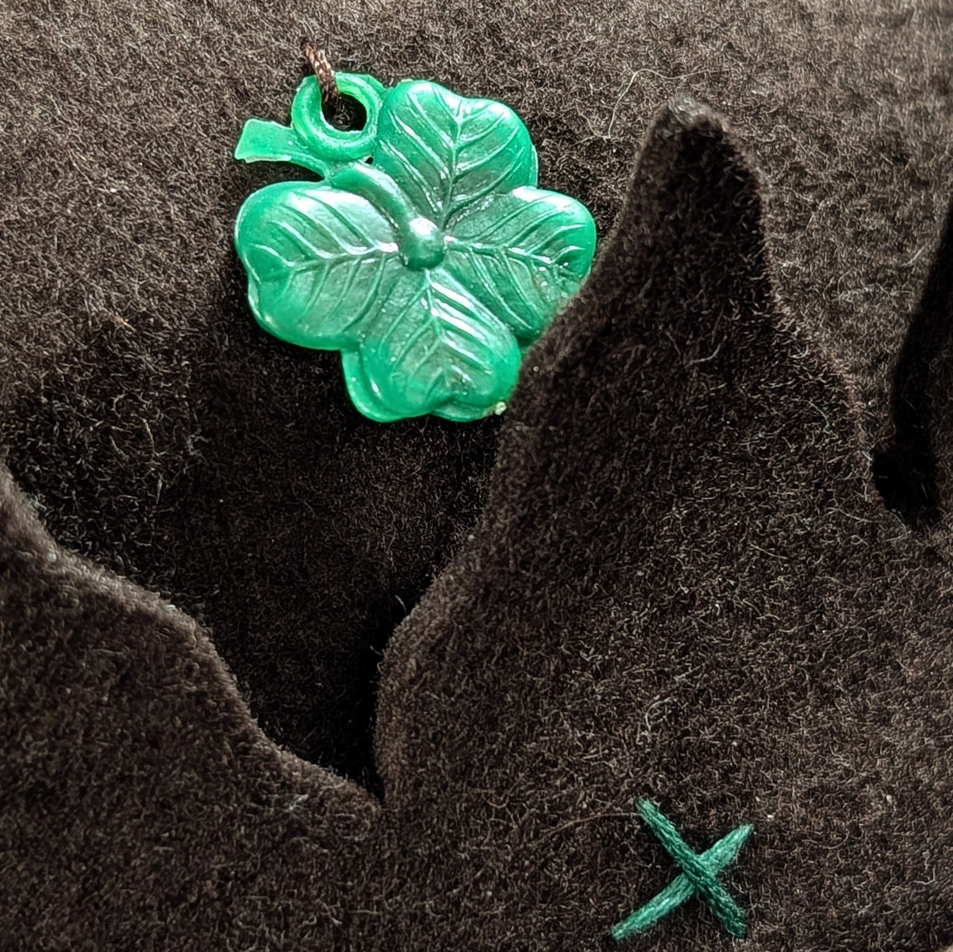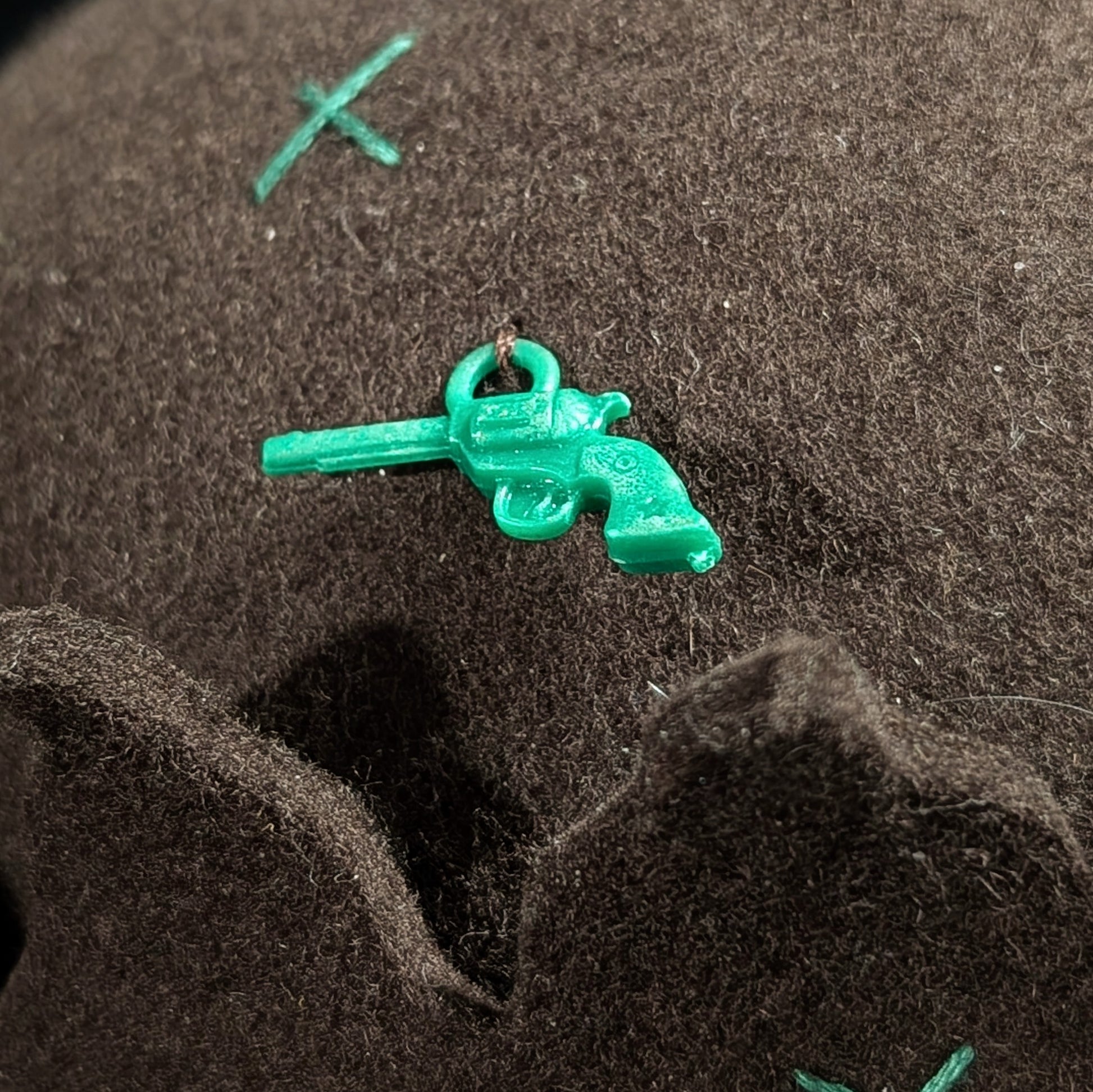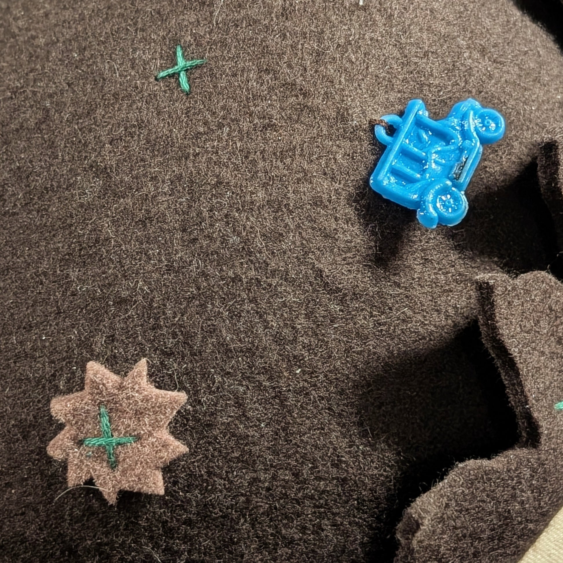 Dark brown felt with forest green X stitches all over with wavy points.